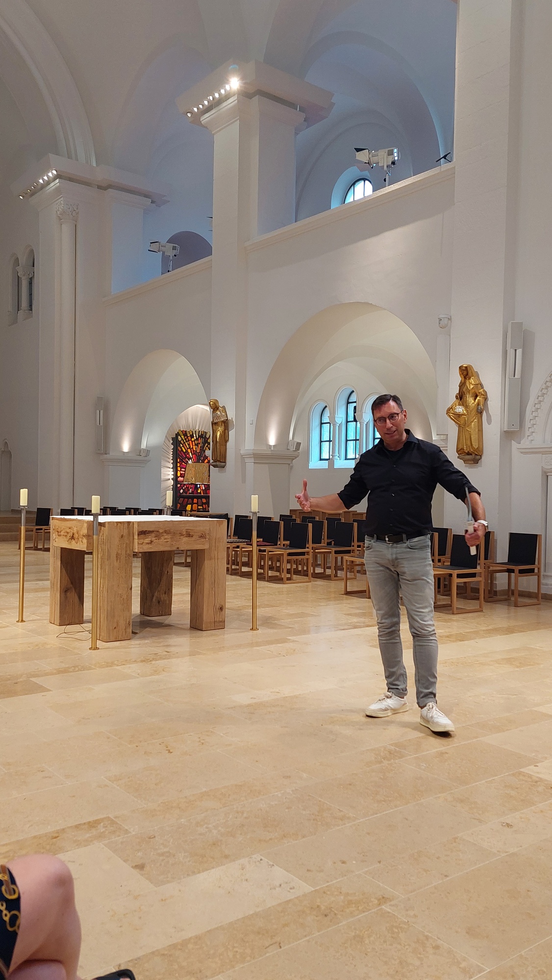 Am Nachmittag lud die Generaloberin der Schwestern des Erlösers, Sr. Monika Edinger, zu einem Rundgang durch das neu gestaltete Kloster in der Würzburger Innenstadt ein. Gemeinsam mit Prof. Dr. Martin Stuflesser gab sie einen Einblick in den Zukunftsprozess ihrer Schwesterngemeinschaft, welcher u.a. zu einer Öffnung des Klostergeländes geführt hat. Durch den Umzug der Katholisch-Theologischen Fakultät der Universität Würzburg, das neu eröffnete Cafe Mares, einer Mitmach-Ausstellung über den Orden, die sozial-caritativen Angebote, die Theresienklinik und die neu gestaltete Mutterhauskirche mit neuen Gottesdienstformen haben die Erlöserschwestern ihre Pforten weit geöffnet. Gerade mitten in der quirligen Würzburger Innenstadt hofft man, dass das Klosterareal als Ort der Ruhe, Erholung, Gemeinschaft und geistlichen Stärkung entdeckt wird. Ähnlich wie bei den aktuellen Herausforderungen im Bistum Würzburg hätten sich die Schwestern auf einen längeren Weg des Diskutierens, Nachdenkens, Ausprobierens, aufeinander Hörens und Betens gemacht, so Edinger und Stuflesser. Angesichts der großen Dimension dieses Prozesses blieben auch Konflikte nicht aus. „Als wir gemeinsam mit allen Schwestern die Entscheidung getroffen haben, als Erlöserschwestern hier im Würzburger Kloster zu bleiben war klar, dass das kein einfacher Weg wird. Es war schon gewaltig, was sich unsere Schwestern selbst abverlangt haben.“, berichtete Generaloberin Sr. Monika Edinger. Die Vertreter des Diözesanrates zeigten sich tief beeindruckt und konnten viele Parallelen zu den Veränderungsprozessen in ihren Gemeinden vor Ort entdecken. Der Klosterbesuch endete mit einem feierlichen Abendgebet in der neu gestalteten Mutterhauskirche.