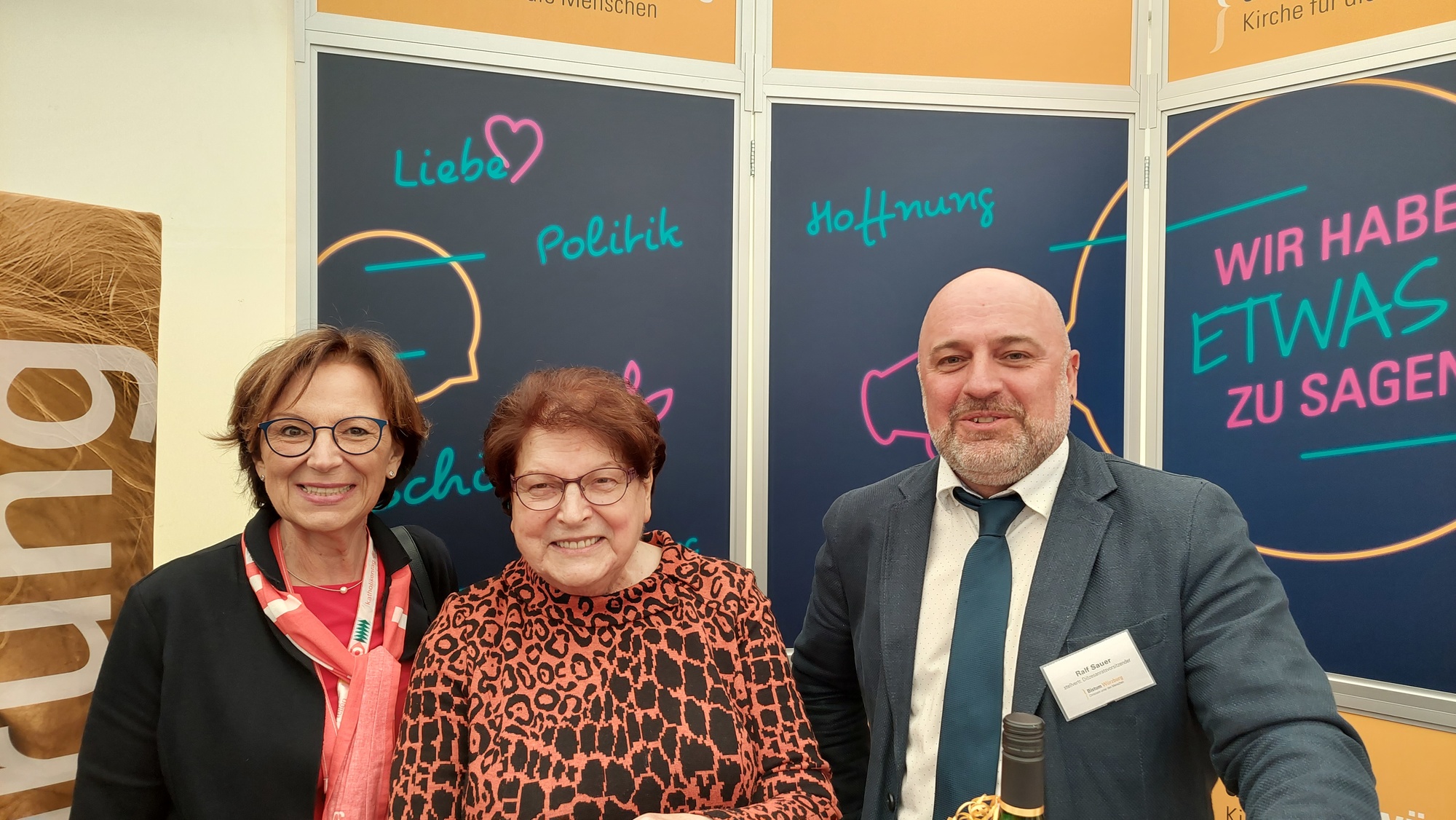 Der Bistumsstand ist für viele Katholikentagsteilnehmer aus Unterfranken ein wichtiger Anlaufpunkt. Ludwig Franz aus Laufach (Landkreis Aschaffenburg) ist 82 Jahre alt und berichtet Florian Liebler, Geschäftsführer des Diözesanrats der Katholiken, voller Stolz, dass er schon zum 21. Mal an der Großveranstaltung teilnehme. Alfred Neugebauer, Diözesanratsmitglied aus Rentweinsdorf im Landkreis Haßberge, freut sich, dass gerade der Bischof am Stand ist, und nutzt zusammen mit Frau und zwei seiner Kinder die Gelegenheit für ein Erinnerungsfoto.