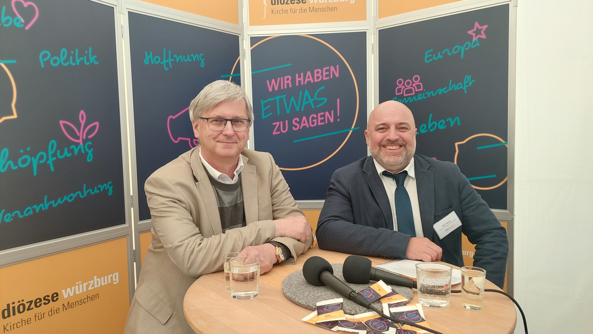 „Wir haben etwas zu sagen“ steht in großen Lettern über einer Ecke des Bistumsstands. Dort hat Bischof Jung auf einem Hocker Platz genommen. Er ist einer von insgesamt neun Persönlichkeiten aus Unterfranken, die bis Samstag, 28. Mai, dort zu aktuellen Themen Rede und Antwort stehen. Später am Tag interviewt Ralf Sauer, stellvertretender Vorsitzender des Diözesanrats der Katholiken, den ehemaligen Wirtschaftsweisen Professor Dr. Peter Bofinger und die Generaloberin der Oberzeller Franziskanerinnen, Schwester Dr. Katharina Ganz.