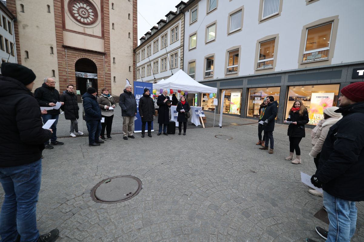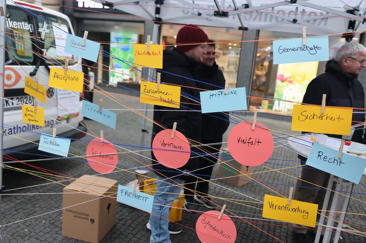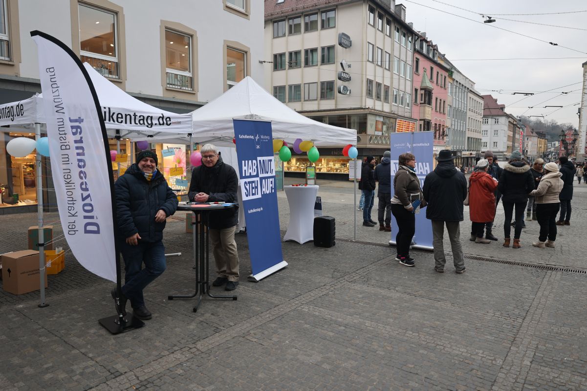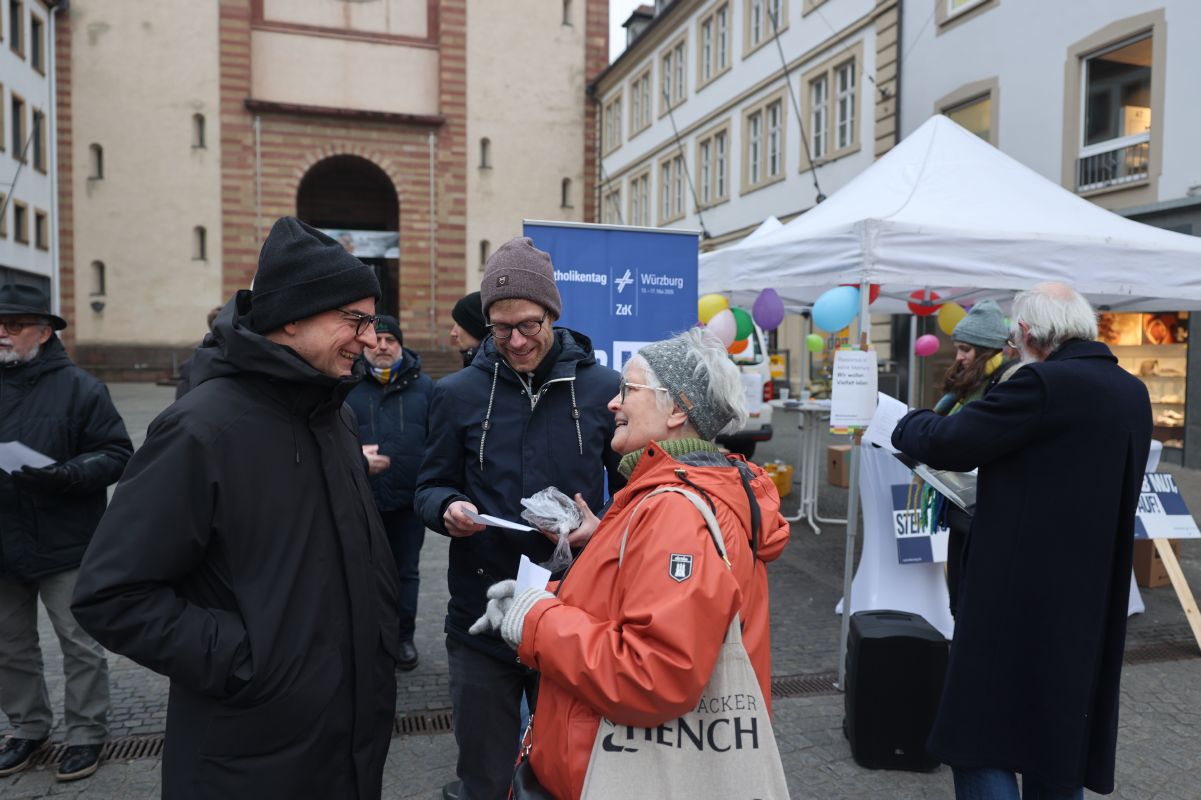 Beteiligt waren unter anderem Bischof Dr. Franz Jung, Diözesanratsvorsitzender Dr. Michael Wolf sowie Marc Frings, Generalsekretär des ZdK. Ähnliche Veranstaltungen gab es im Vorfeld der Bundestagswahl laut Frings unter anderem in Osnabrück, Freiburg, Münster und Leipzig. Auf die Besucherinnen und Besucher in der Würzburger Innenstadt warteten inhaltliche Impulse in Gesprächen mit Professorin Dr. Michelle Becka, Inhaberin der Würzburger Professur für Christliche Sozialethik, und Kabarettistin Birgit Süß. Außerdem gab es Straßenmusik. Passanten waren unter anderem eingeladen, auf Zettel zu schreiben, was sie persönlich für die Demokratie für zentral erachten. Die Aktion endete gegen 17 Uhr mit einer Andacht und dem Segen.