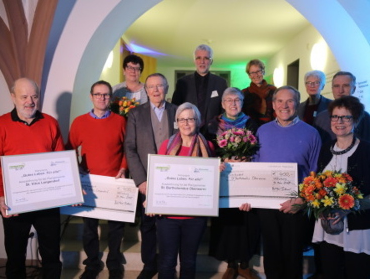 In Langendort habe das kirchliche Engagement in den vergangenen mehr als 30 Jahren vieles zum Positiven verändert, hob Christiane Hetterich vom Referat „Mission-Entwicklung-Frieden“ in ihrer Lobesrede auf die Pfarrei Sankt Vitus hervor. So gebe es dort seit den 1980er Jahren einen Verkauf von fair gehandelten Produkten. Biofleisch sei schon lange Standard bei Pfarreiveranstaltungen. Der kulinarische Renner beim Pfarrfest seien aber seit den 1990er Jahren „Getreideküchle mit Salat“. Zudem spende die Pfarrei seit langer Zeit immer zehn Prozent des Festerlöses an Misereor. Pionierarbeit sei in Langendorf im Jahr 2001 bei der Renovierung des Pfarrhauses geleistet worden. Seither besitzt dieses eine Photovoltaikanlage mit Warmwasserkollektoren, eine CO2-neutrale Pelletheizung, Regenwasser wird für Toiletten und Garten genutzt, Kirche und Pfarrhaus beziehen Ökostrom. Diese Pionierarbeit habe Früchte getragen: „Viele Privathaushalte haben inzwischen auf ihren Dächern Solaranlagen installiert, am Ortsrand ist eine Biogasanlage entstanden und ein altes Mühlrad an der Saale wurde zur Stromerzeugung reaktiviert“, lobte Hetterich. Im Bereich Bildung sei Langendorf ebenso Vorreiter. Schon ehe das Bistum Würzburg einen Umweltreferenten hatte, habe der komplette Pfarrgemeinderat an Fortbildungsveranstaltungen zu Umweltthemen teilgenommen. „Eurer umweltpolitischen Bewusstseinsbildung ist es zu verdanken, dass die Bevölkerung von Langendorf 2015 den dritten Versuch verhindern konnte, ein Gewerbegebiet mit großem Flächenverbrauch am Ortsrand zu errichten.“ Langendorfs Kirchenpfleger Valentin Fell dankte für die Ehrung. Alles Handeln sei vom christlichen Glauben her motiviert, hob er hervor.
